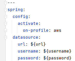 우리가 해당 파일을 application-aws.yml이라고 작성해주었기 때문에 application.yml에서 on-profile: aws를 보고 아 우리가 필요한 정보가 application-aws.yml에 있구나!를 자동으로 파악하여 application-aws.yml에서 필요한 정보를 가져온다고 한다.