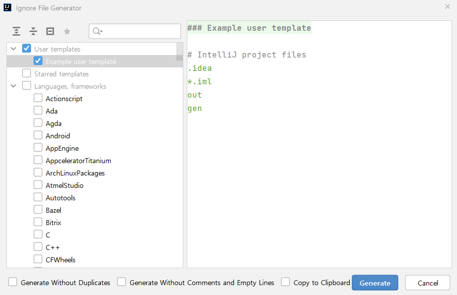 Generate 버튼을 누르면 본인 프로젝트에 ignore 파일이 정상적으로 생긴 것을 볼 수 있다!