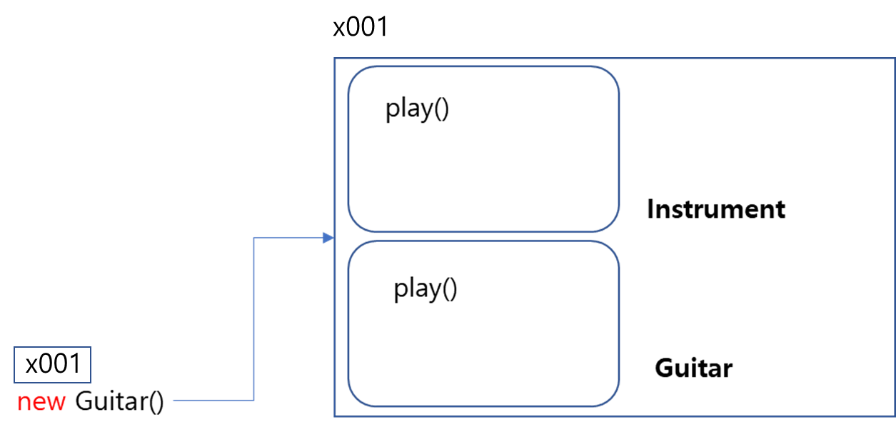 ⭐ 즉, 상속을 하면 부모 클래스도 함께 생성되는 것이다. 겉으로 볼 때는 Guitar 하나의 객체가 생성되는 것 같지만 그 속을 보면 부모와 자식이 모두 생성된다.