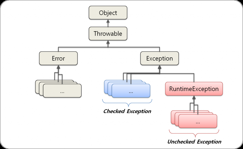 Exception 클래스는 예외의 슈퍼 클래스로 Checked Exception과 Runtime Exception 으로 나뉜다. Unchecked Exception이 Runtime Exception의 하위 클래스이다. (Error는 Exceptoin에 속하지 않는다.)