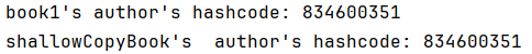 System.out.println("shallowCopyBook's author's hashcode: " + shallowCopyBook.author.hashCode() + "\n");