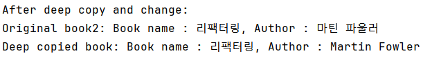 그래서 deepCopy() 를 통해 deepCopyBook 객체를 만들고 changeAuthor() 메소드를 통해 저자 이름을 바꾸게 되면 book2 객체에 영향을 주지 않는다.