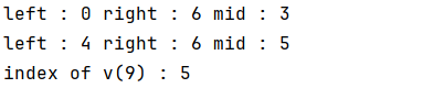 - left = 4, right = 6이므로 mid = 5이다. arr[mid]는 arr[5] = 9이다. 목표 값이 9와 동일하므로 else문에 들어와서 mid를 리턴해준다.